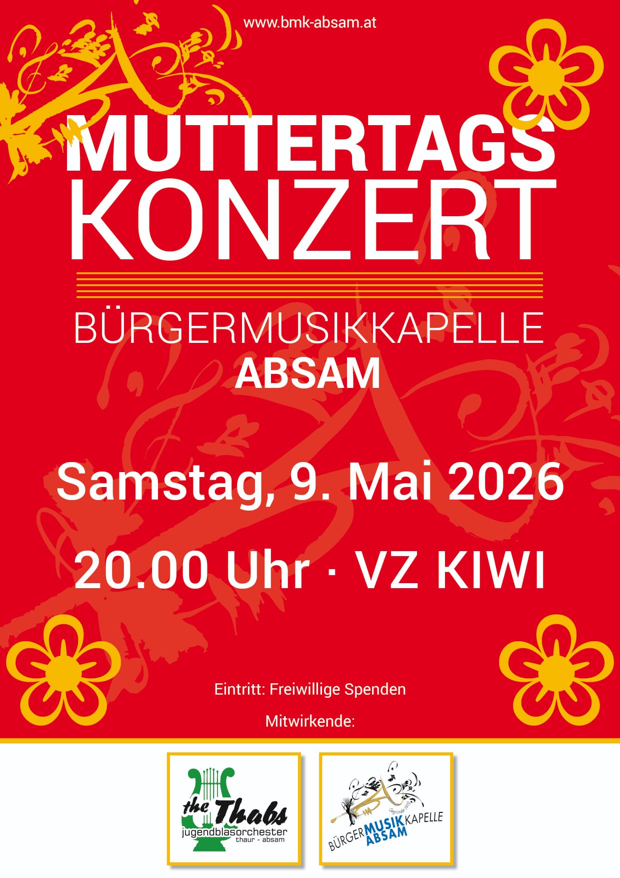 Die Bürgermusikkapelle Absam lädt am Samstag, den 09. Mai. 2026, zu ihrem alljährlich stattfindenden Muttertagskonzert im Kultur- und Veranstaltungszentrum KIWI in Absam ein.